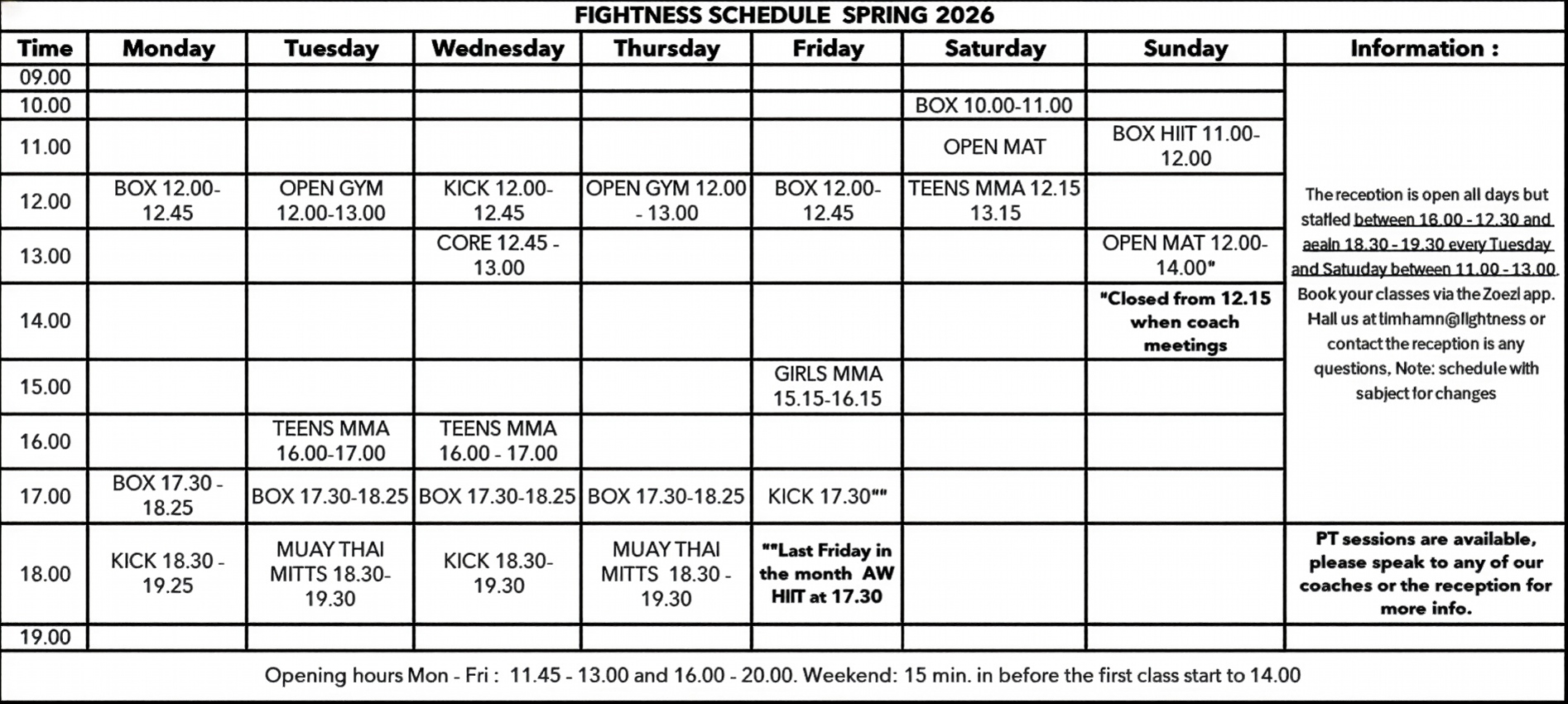 Känn kraften. Bygg din styrka. Ta kontroll över din kropp. På Fightness Limhamn tränar du inte bara, du utvecklas. Våra klasser kombinerar styrka och kondition på ett sätt som utmanar dig, stärker dig och tar dig närmare ditt bästa jag. Du boxas och sparkas på din egen säck, i en trygg miljö med minimal skaderisk, där du kan fokusera fullt ut på egen utveckling.